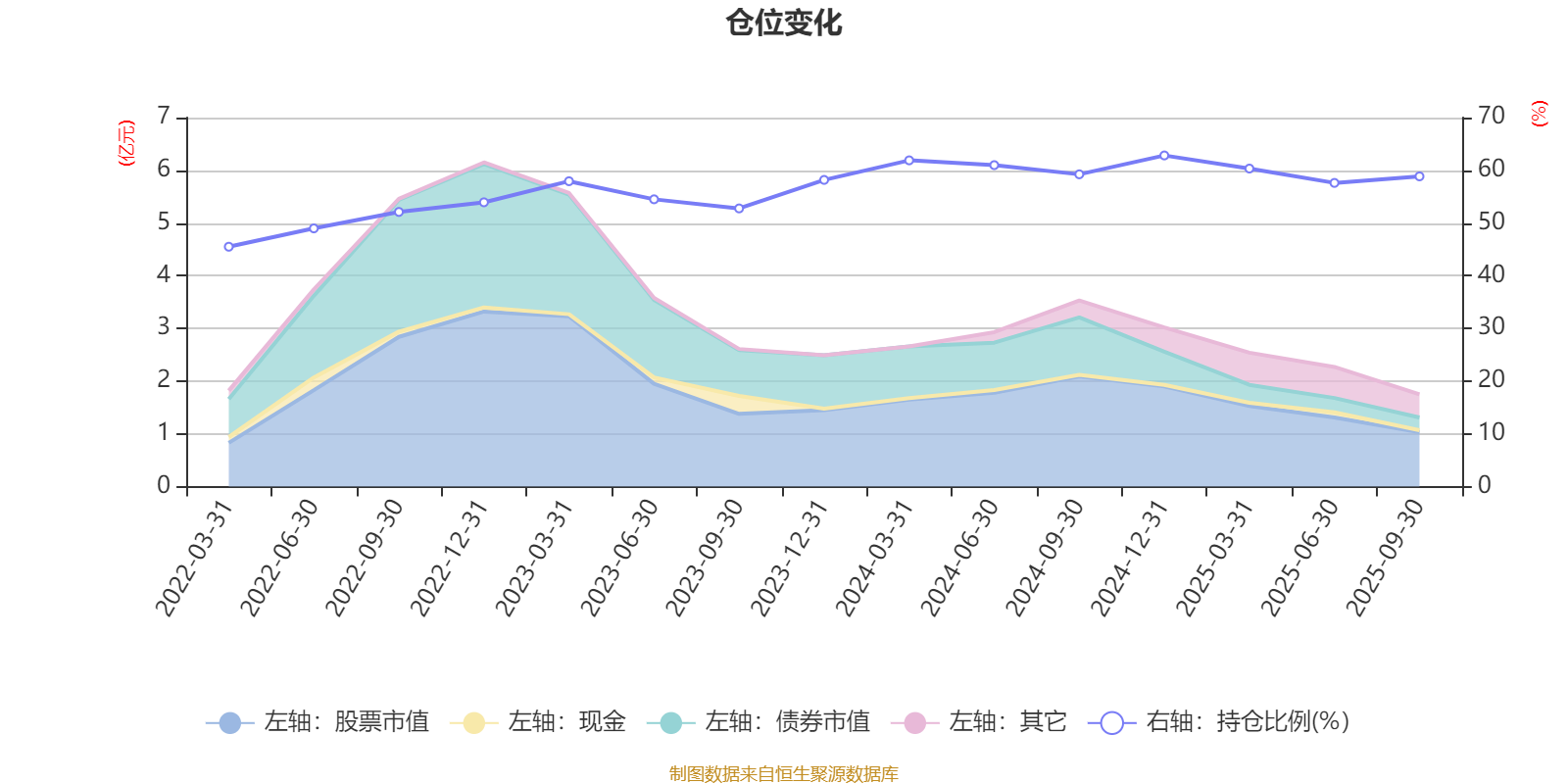 据定期报告数据统计,近三年平均股票仓位为58.25%,同类平均为67.23%。2024年末基金达到62.82%的最高仓位,2022年一季度末最低,为45.5%。