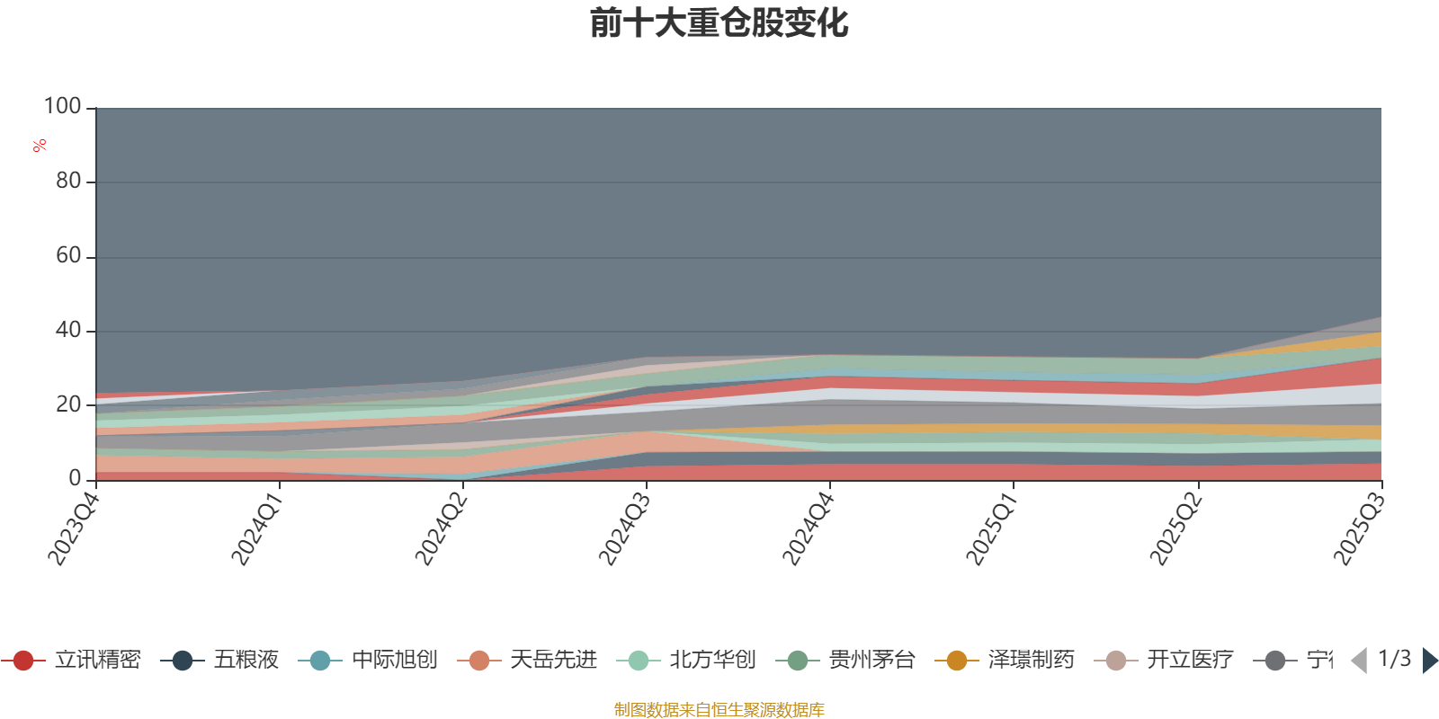 截至2025年三季度末,基金十大重仓股分别是寒武纪、宁德时代、科伦药业、立讯精密、新易盛、中芯国际、泽璟制药、北方华创、五粮液、恒瑞医药。