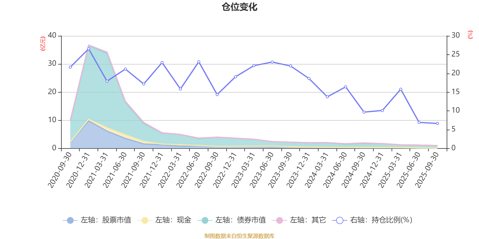 据定期报告数据统计,近三年平均股票仓位为15.33%,同类平均为19.03%。2020年末基金达到26.54%的最高仓位,2025年三季度末最低,为6.63%。