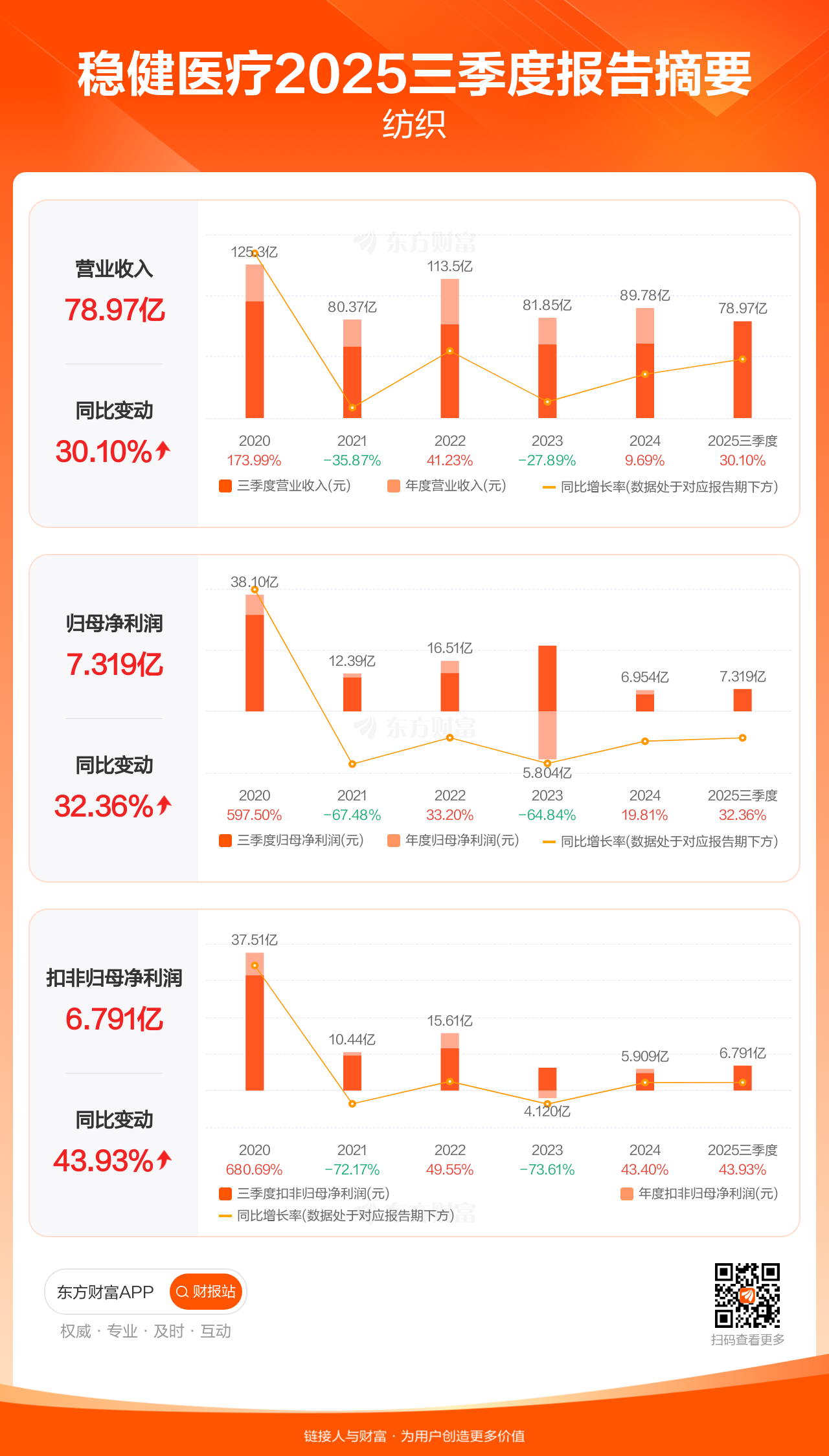 稳健医疗10月28日发布2025年三季报显示,公司前三季实现营业收入78.97亿元,同比增长30.10%;归母净利润7.32亿元,同比增长32.36%;扣非归母净利润6.79亿元,同比增长43.93%。