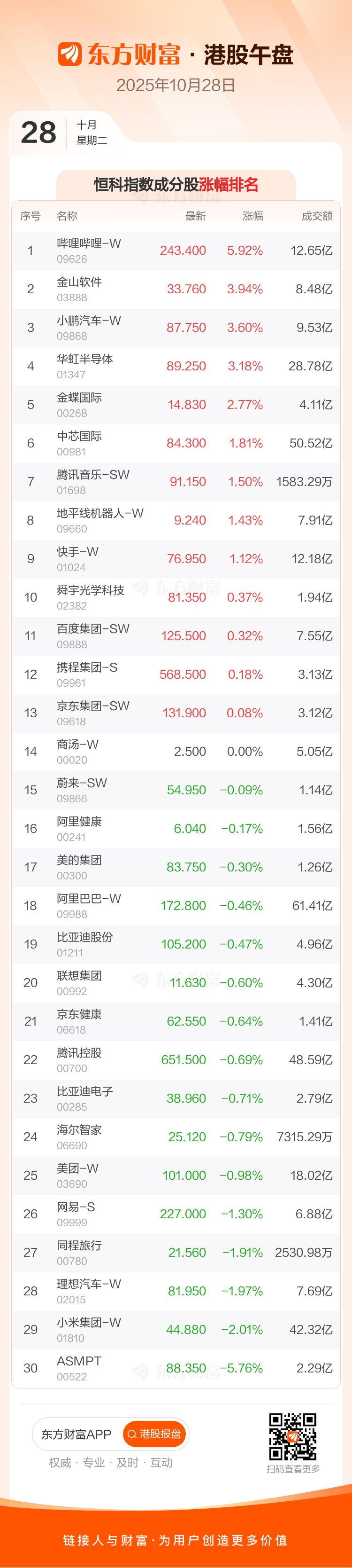 10月28日港股午盘:恒指涨0.01% 信义光能领涨成分股