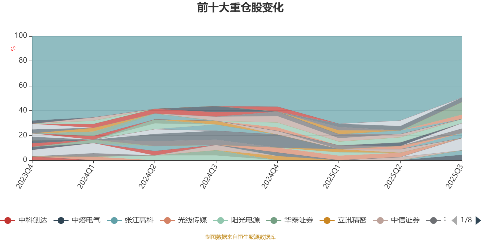 截至2025年三季度末,基金十大重仓股分别是新易盛、中际旭创、同花顺、中熔电气、东方财富、张江高科、移远通信、华海清科、拓荆科技、恺英网络。