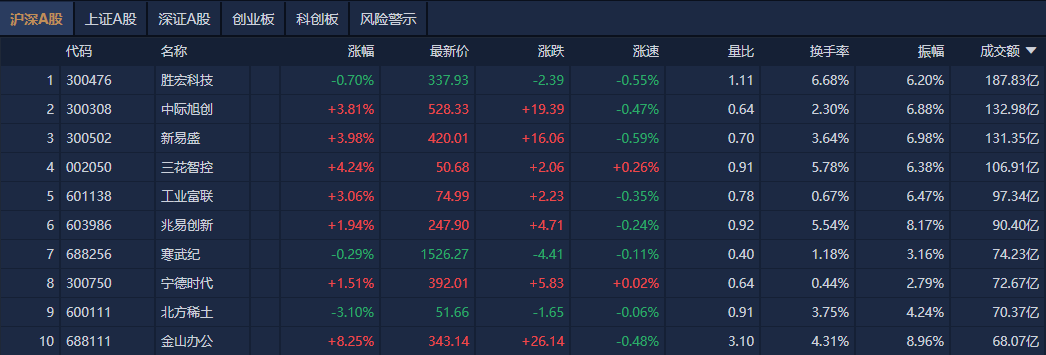 个股方面,胜宏科技成交额超187亿元居首,中际旭创、新易盛、三花智控成交额靠前。
