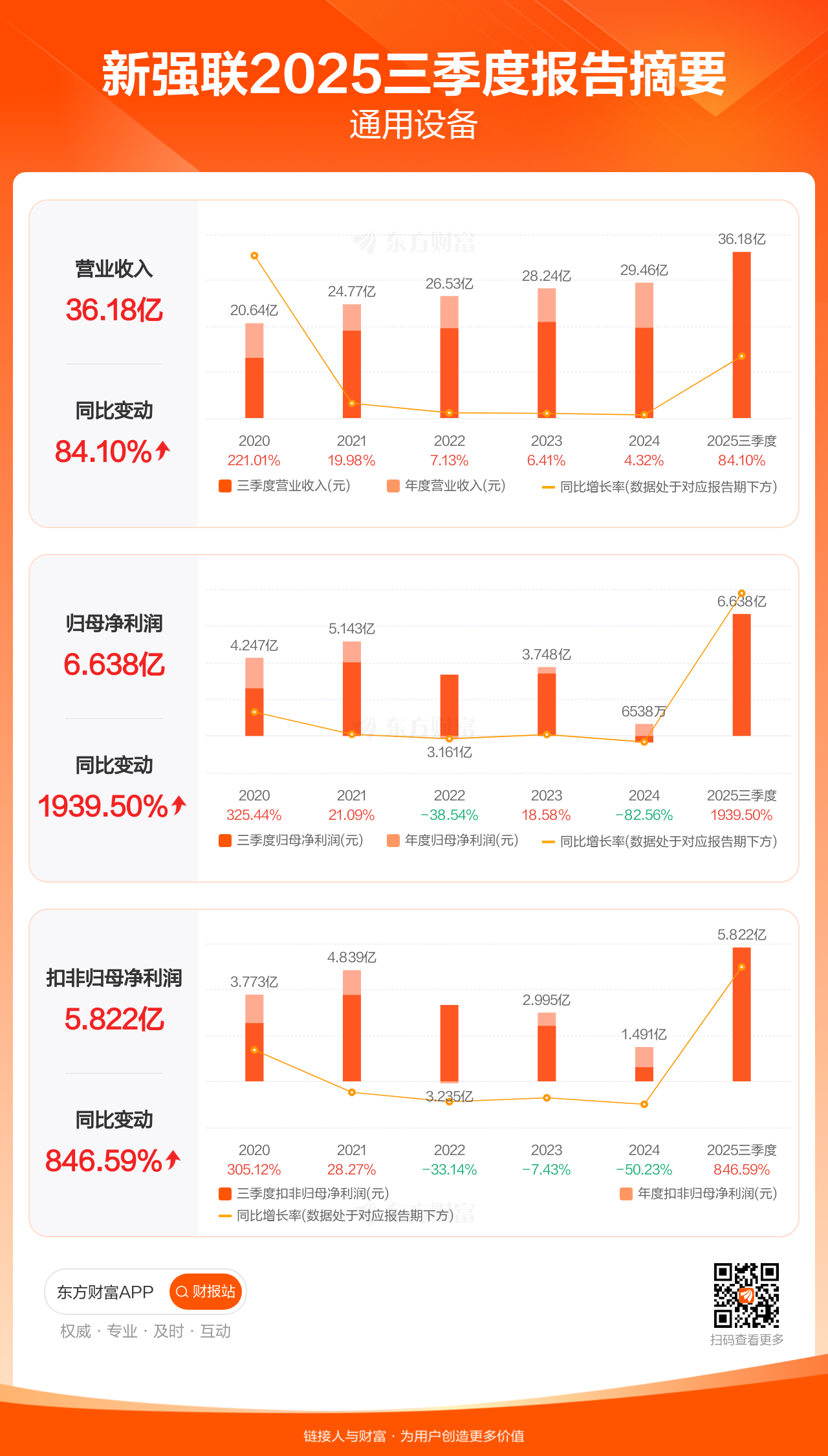 新强联10月22日发布2025年三季报显示,公司前三季实现营业收入36.18亿元,同比增长84.10%;归母净利润6.64亿元,同比增长1939.50%;扣非归母净利润5.82亿元,同比增长846.59%。