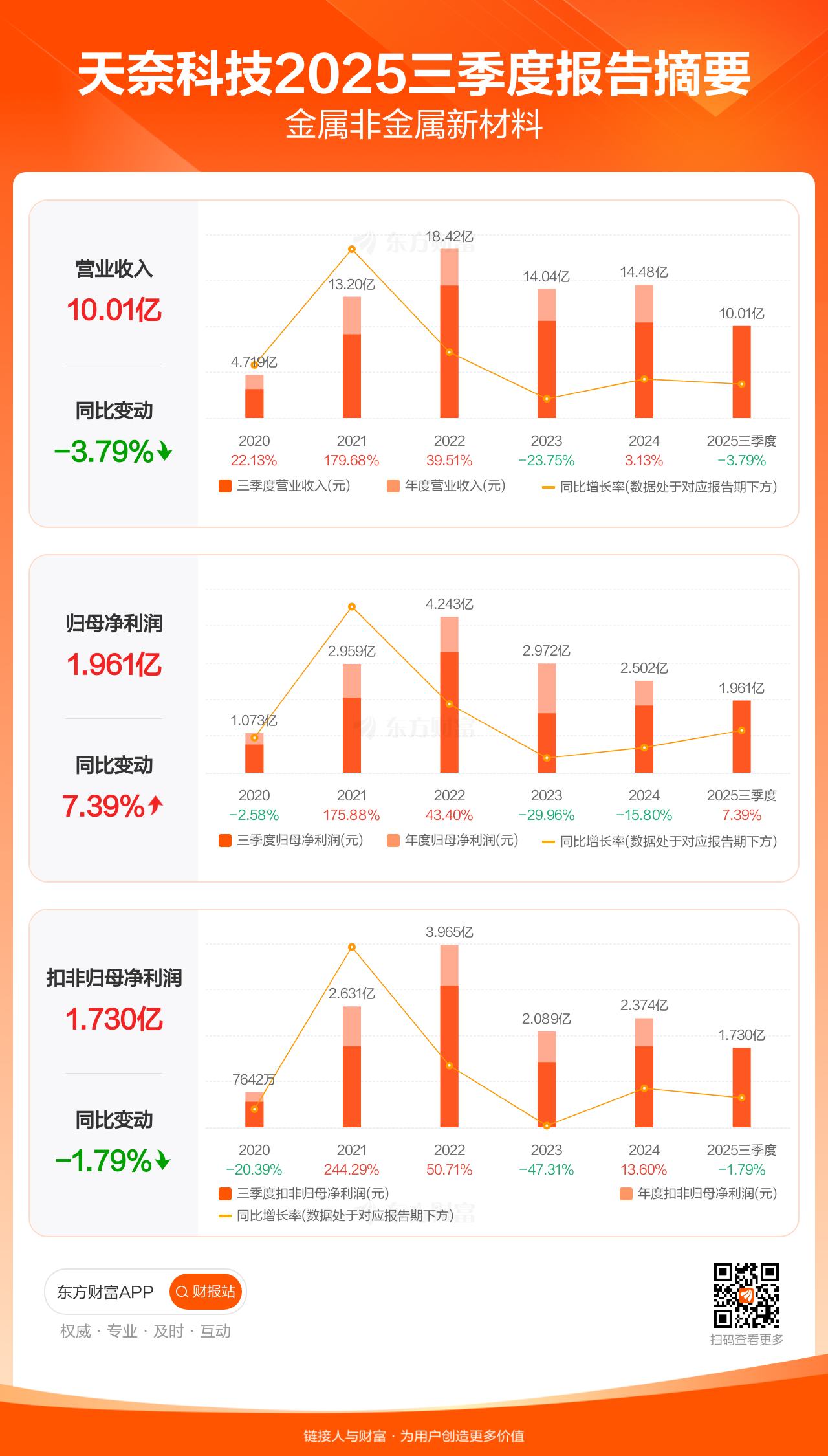 天奈科技10月27日发布2025年三季报显示,公司前三季实现营业收入10.01亿元,同比下滑3.79%;归母净利润1.96亿元,同比增长7.39%;扣非归母净利润1.73亿元,同比下滑1.79%。