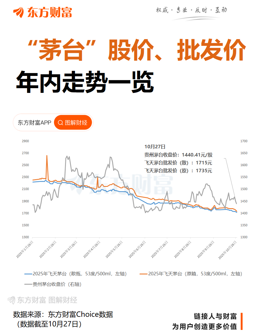 10月28日,酒类行情监测平台“今日酒价”数据显示,2025年53度500ml飞天茅台散瓶批发参考价报1690元,较前一日下跌25元,首次跌破1700元/瓶大关,再创上市以来的新低;原箱报1715元,较前一日下跌20元。两款产品较上线时的2220元、2255元累计跌幅均已超过31%。