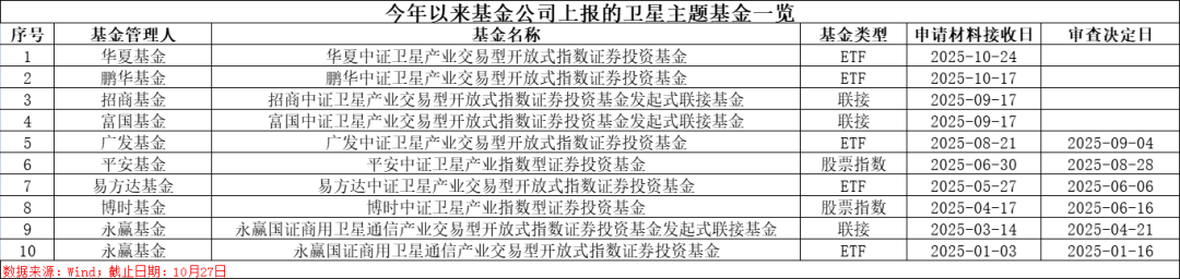 进入四季度,布局节奏进一步加快:10月17日鹏华中证卫星产业ETF、10月24日华夏中证卫星产业ETF相继提交申报材料;10月27日,易方达中证卫星产业ETF正式启动认购,博时中证卫星产业指数基金也在同步募集中。