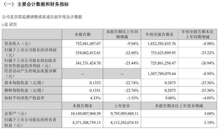 其中第三季度,公司营业收入为7.53亿元,同比下降9.9%;归母净利润为3.54亿元,同比下降22.6%;扣非归母净利润为3.42亿元,同比下降23.4%;EPS为0.1349元。