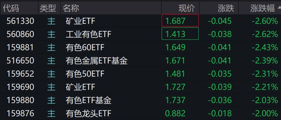 受盘面影响,矿业、有色相关ETF跌超2%。
