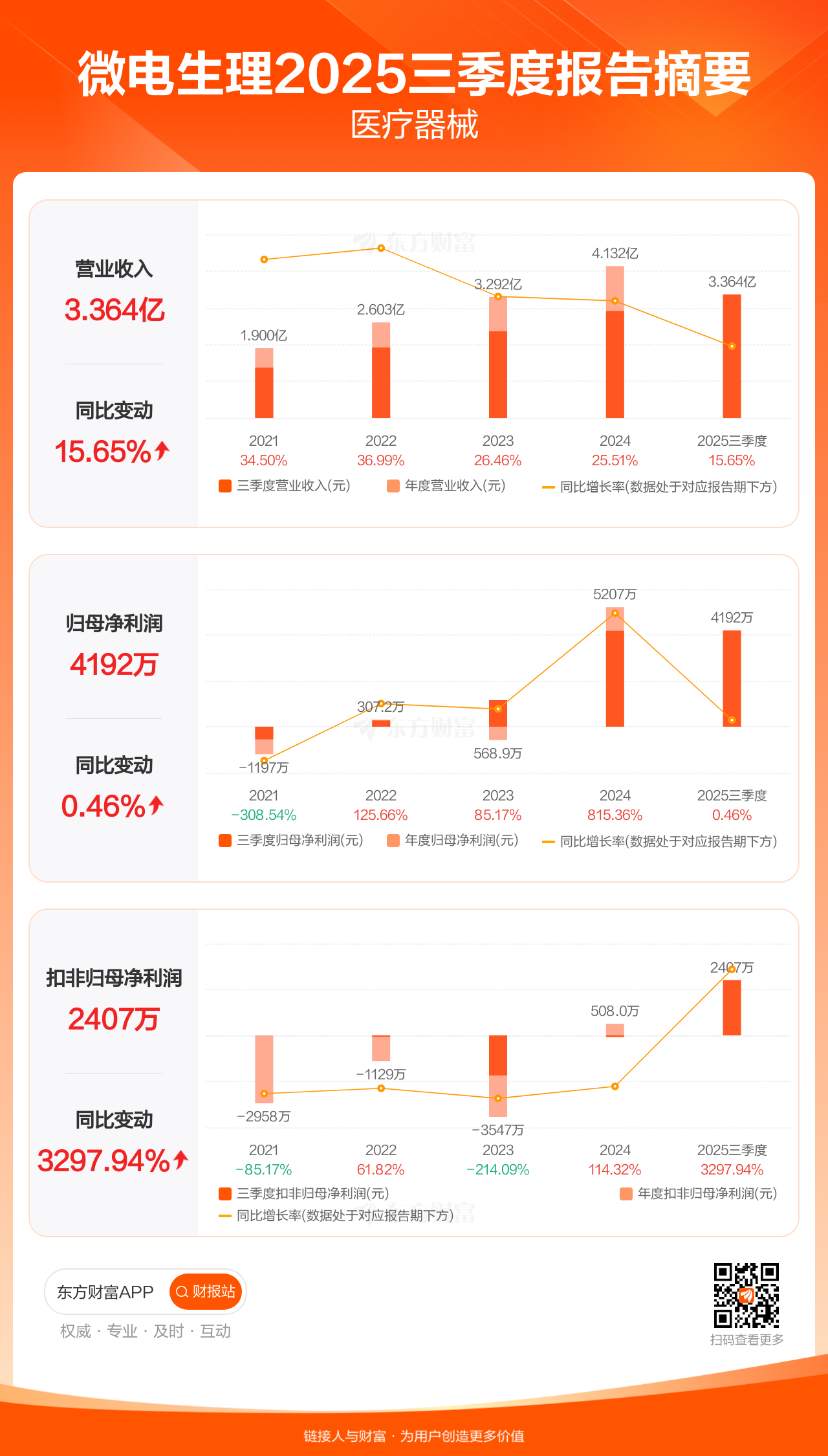 微电生理10月28日发布2025年三季报显示,公司前三季实现营业收入3.36亿元,同比增长15.65%;归母净利润4192.06万元,同比增长0.46%;扣非归母净利润2406.60万元,同比增长3297.94%。