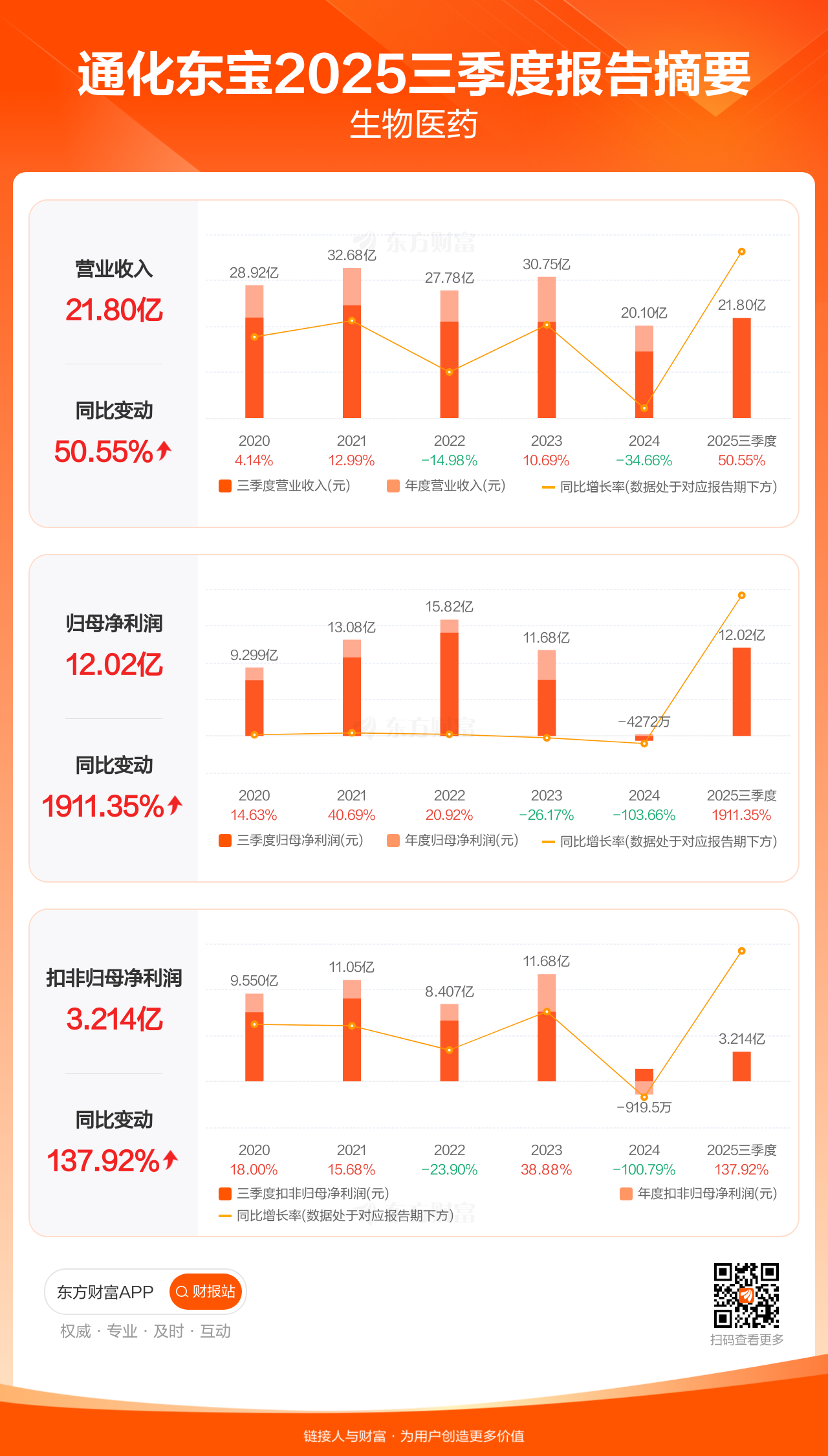 通化东宝10月28日发布2025年三季报显示,公司前三季实现营业收入21.80亿元,同比增长50.55%;归母净利润12.02亿元,同比增长1911.35%;扣非归母净利润3.21亿元,同比增长137.92%。