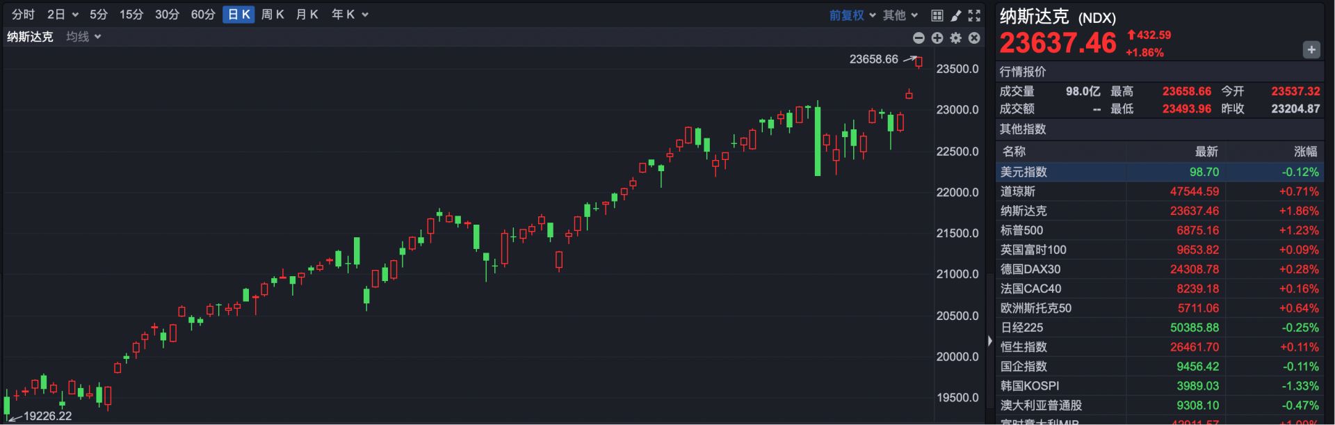 消息面,昨晚美股各类指数全线大涨,均创出历史新高。其中,道琼斯工业指数上涨0.71%,纳斯达克指数上涨1.86%,标普500指数上涨1.23%。美股飙升过程中,热门中概股全线爆发。大全新能源涨逾14%,趣店涨逾9%,小马智行、小鹏汽车涨逾6%,晶科能源涨逾5%,文远知行、百度集团、搜狐、禾赛科技等涨逾4%,爱奇艺、腾讯音乐、京东集团等涨逾3%,万国数据、阿里巴巴、蔚来等涨逾2%。