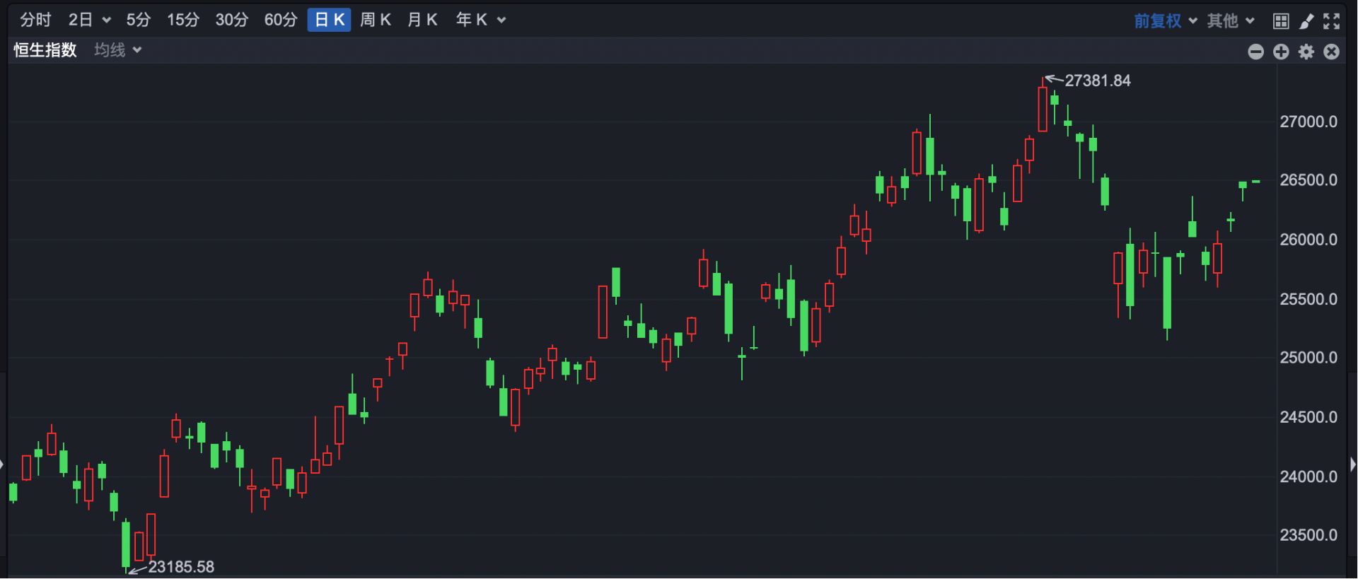 截至发稿,恒生指数开盘报26508.75点,上涨75.05点,涨幅0.28%。