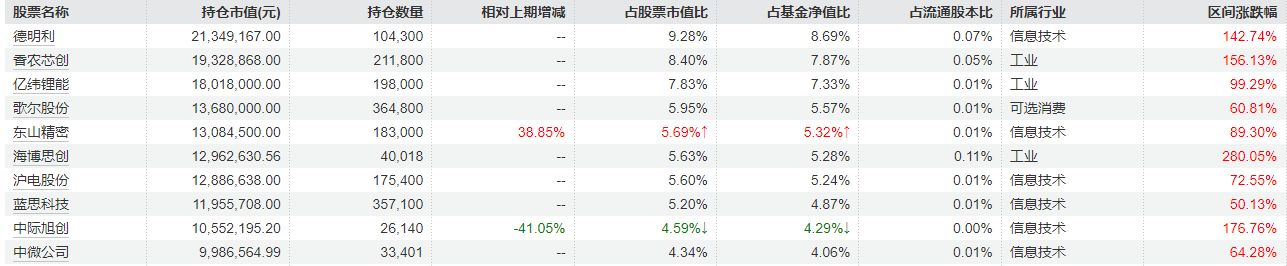 从持仓配置上看,基金经理在三季度对AI算力方向进行了倾斜。前十大重仓股中,除东山精密、中际旭创外,其他八只全部为新进重仓品种,包括德明利、香农芯创、蓝思科技、中微公司等个股。基金经理表示,季度内保持了高仓位运行,9月以来,加大了对存储板块的配置,关注到存储芯片进入涨价周期,AI推理正驱动数据存储的需求快速爆发。