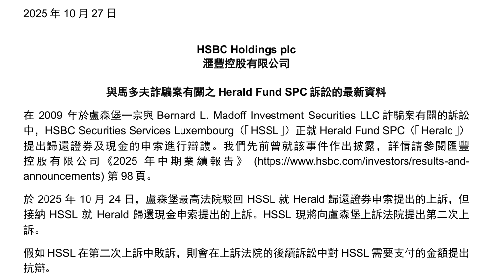 10月27日,汇丰控股(00005)发布公告,披露与马多夫诈骗案相关的Herald Fund SPC诉讼最新动态,公司拟在2025年第三季综合财务业绩中确认11亿美元准备,该准备将对集团普通股权益一级资本比率产生约15个基点的影响。