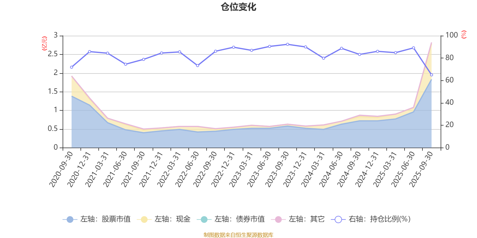据定期报告数据统计,近三年平均股票仓位为85.53%,同类平均为85.51%。2023年三季度末基金达到92.31%的最高仓位,2025年三季度末最低,为65.03%。