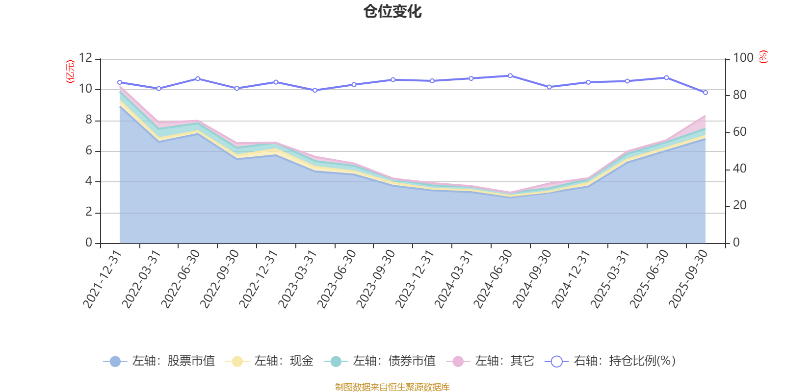 据定期报告数据统计,近三年平均股票仓位为87.06%,同类平均为86.74%。2024年上半年末基金达到90.86%的最高仓位,2025年三季度末最低,为81.71%。