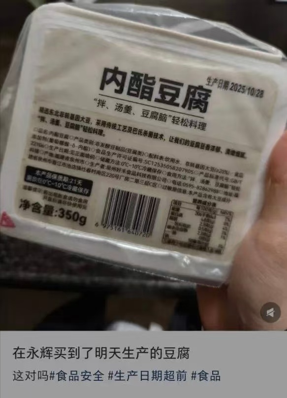 福建泉州一名消费者10月27日在社交平台发文称,在永辉超市购买到一盒内酯豆腐,包装上标注的生产日期竟是“2025年10月28日”。此事引发较大关注,网友调侃其为“穿越豆腐”。