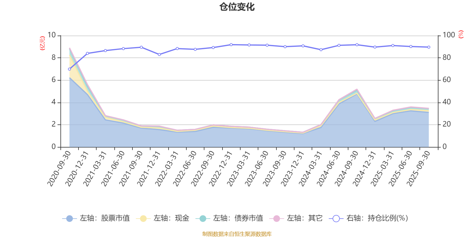 据定期报告数据统计,近三年平均股票仓位为90.53%,同类平均为85.51%。2022年末基金达到91.83%的最高仓位,2020年三季度末最低,为69.92%。