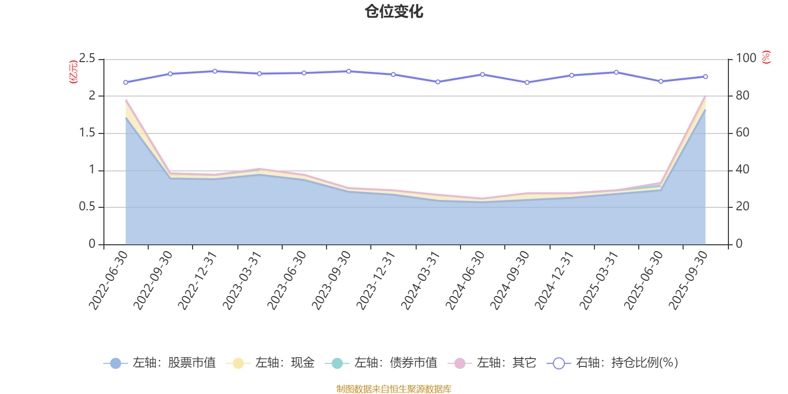 据定期报告数据统计,近三年平均股票仓位为91.07%,同类平均为86.77%。2022年末基金达到93.47%的最高仓位,2024年三季度末最低,为87.42%。