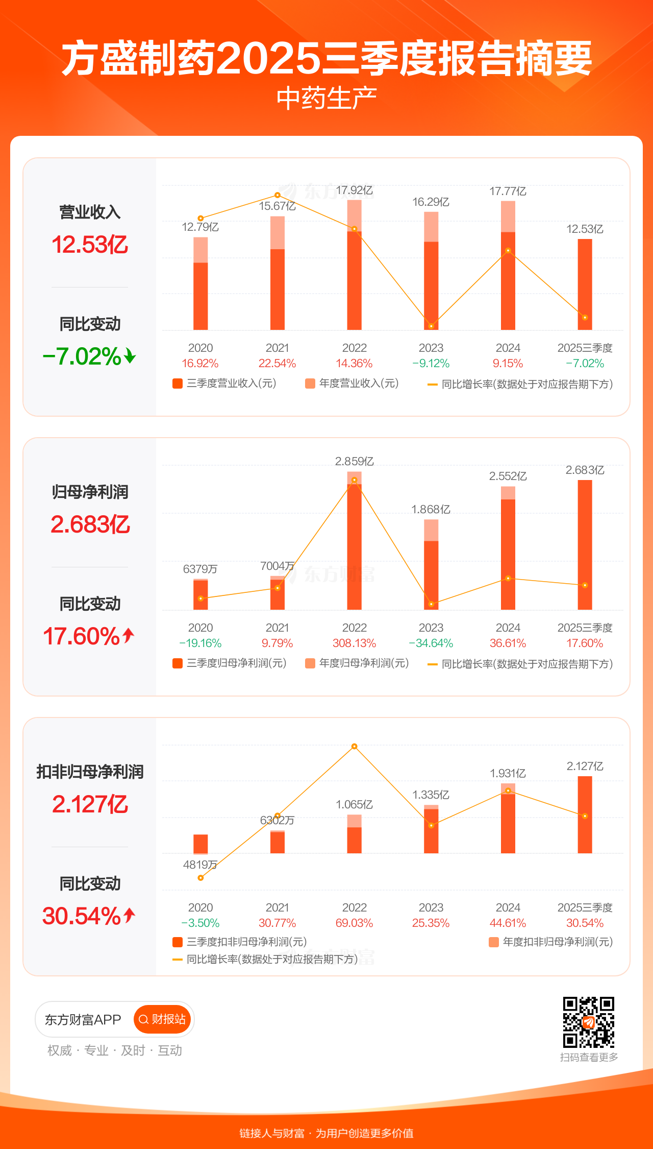 方盛制药10月24日发布2025年三季报显示,公司前三季实现营业收入12.53亿元,同比下滑7.02%;归母净利润2.68亿元,同比增长17.60%;扣非归母净利润2.13亿元,同比增长30.54%。