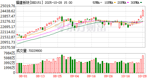 个股方面,上涨股票数量接近2400只,逾70只股票涨停。福建板块掀起涨停潮,路桥信息30cm涨停,海峡创新20cm涨停,福建水泥、漳州发展、平潭发展、厦门空港、厦门港务等10余只股票涨停。
