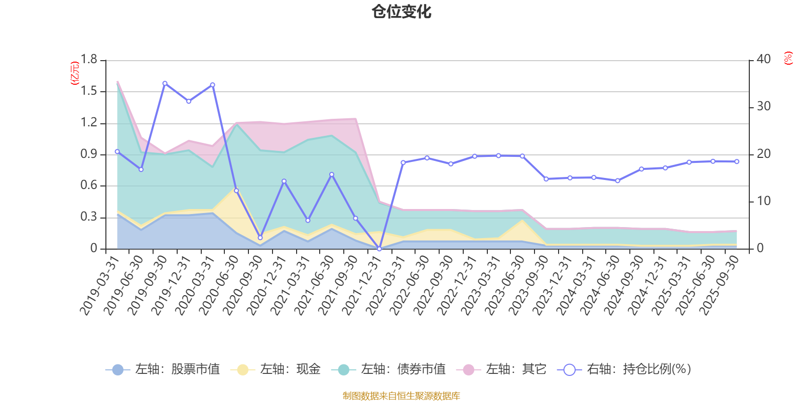 据定期报告数据统计,近三年平均股票仓位为17.34%,同类平均为19.14%。2019年三季度末基金达到35.08%的最高仓位,2020年三季度末最低,为2.37%。