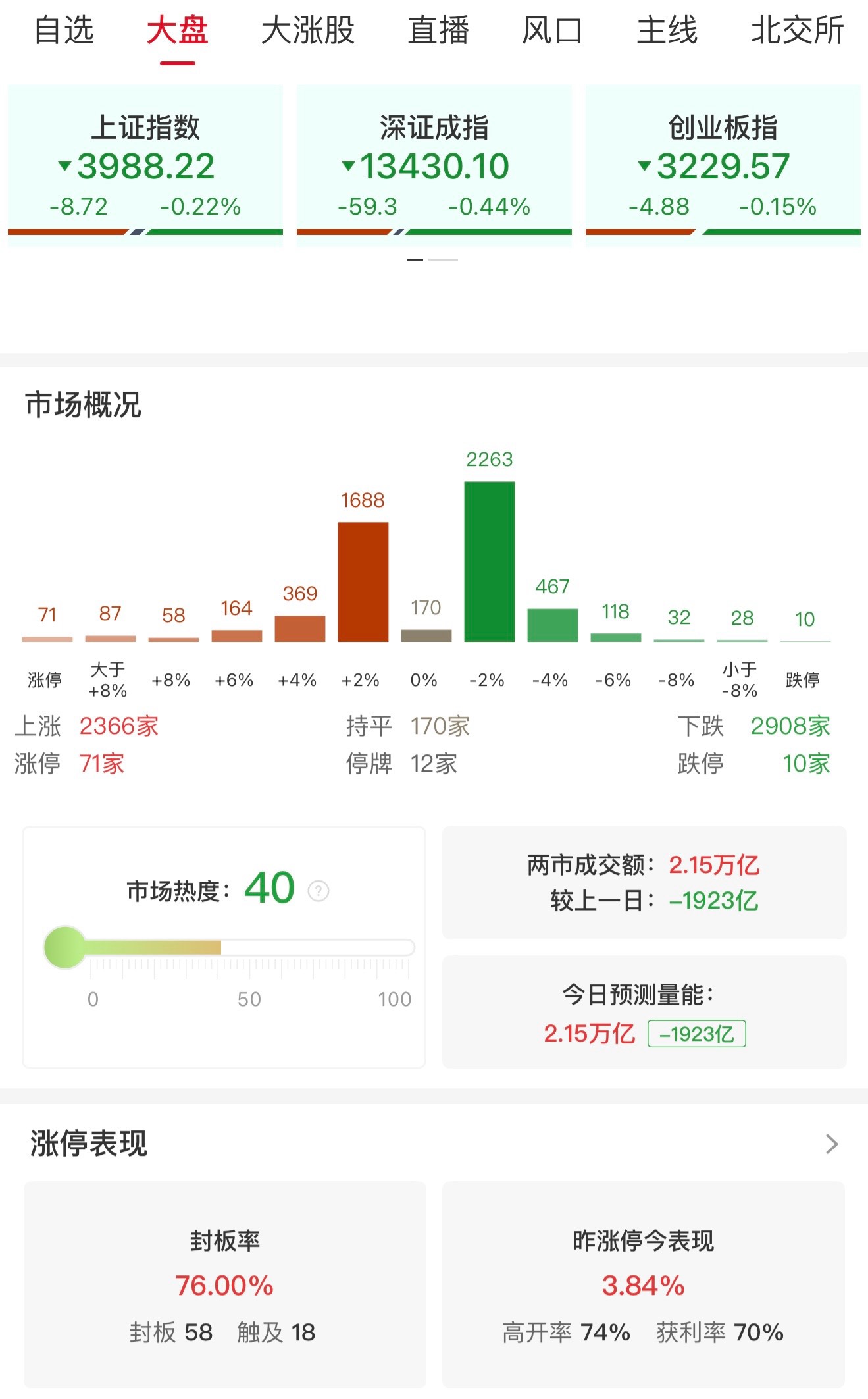 收评:创业板指冲高回落跌0.15% 两市成交额萎缩近2000亿
