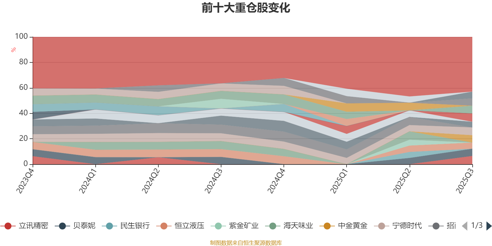 该基金持股集中度较高。截至2025年三季度末,基金十大重仓股分别是立讯精密、东方雨虹、三花智控、宁德时代、三环集团、中金黄金、贝泰妮、新致软件、恒立液压、晨光股份。