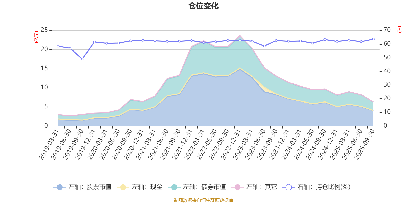 据定期报告数据统计,近三年平均股票仓位为62.09%,同类平均为67.37%。2025年三季度末基金达到63.68%的最高仓位,2019年三季度末最低,为49%。