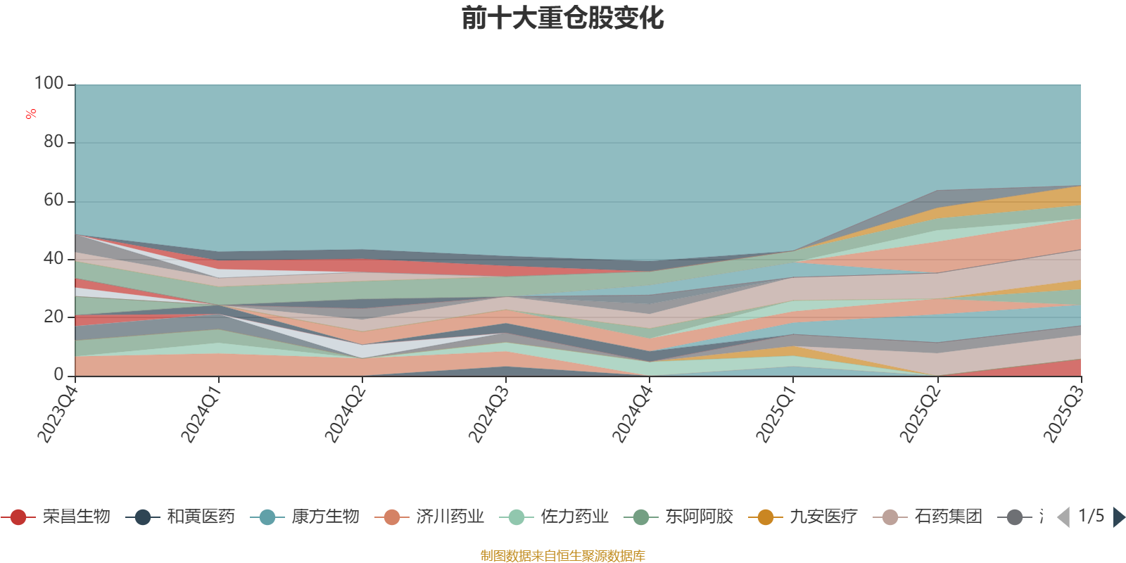 截至2025年三季度末,基金十大重仓股分别是信达生物、科伦博泰生物-B、石药集团、三生制药、中国生物制药、荣昌生物、药明康德、恒瑞医药、阳光诺和、泽璟制药。