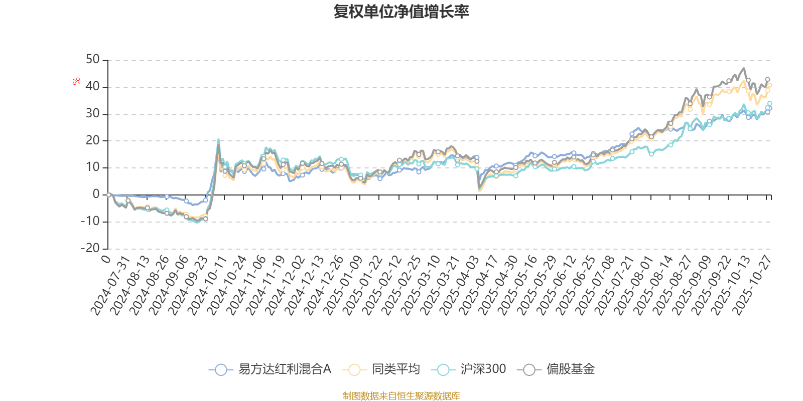 截至10月27日,易方达红利混合A近三个月复权单位净值增长率为6.67%,位于同类可比基金536/689;近半年复权单位净值增长率为18.04%,位于同类可比基金518/688;近一年复权单位净值增长率为21.03%,位于同类可比基金421/653。