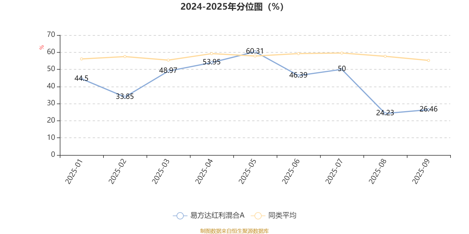 通过所选区间该基金净值增长率分位图,可以观察该基金与同类基金业绩比较情况。图为坐标原点到区间内某时点的净值增长率在同类基金中的分位数。
