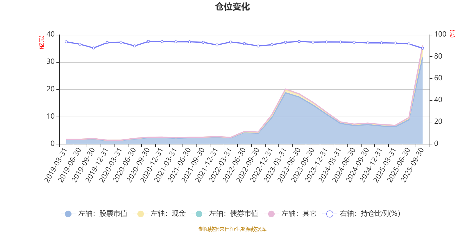 据定期报告数据统计,近三年平均股票仓位为92.37%,同类平均为72.14%。2020年三季度末基金达到93.94%的最高仓位,2025年三季度末最低,为87.71%。