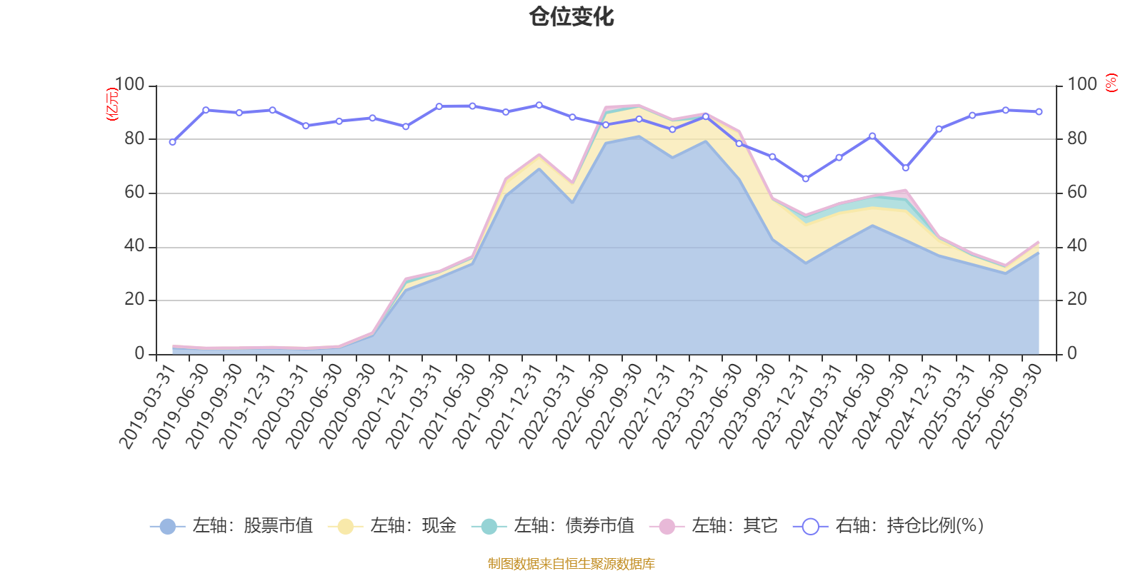 据定期报告数据统计,近三年平均股票仓位为80.63%,同类平均为72.14%。2021年末基金达到92.78%的最高仓位,2023年末最低,为65.38%。