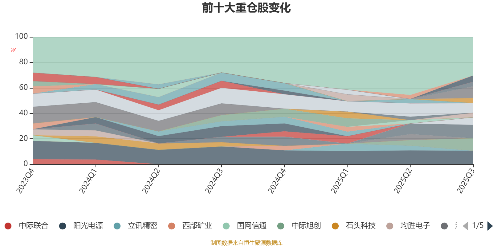 该基金持股集中度较高。截至2025年三季度末,基金十大重仓股分别是阳光电源、宁德时代、中际旭创、新易盛、长江电力、生益科技、博迁新材、欣旺达、石英股份、烽火通信。