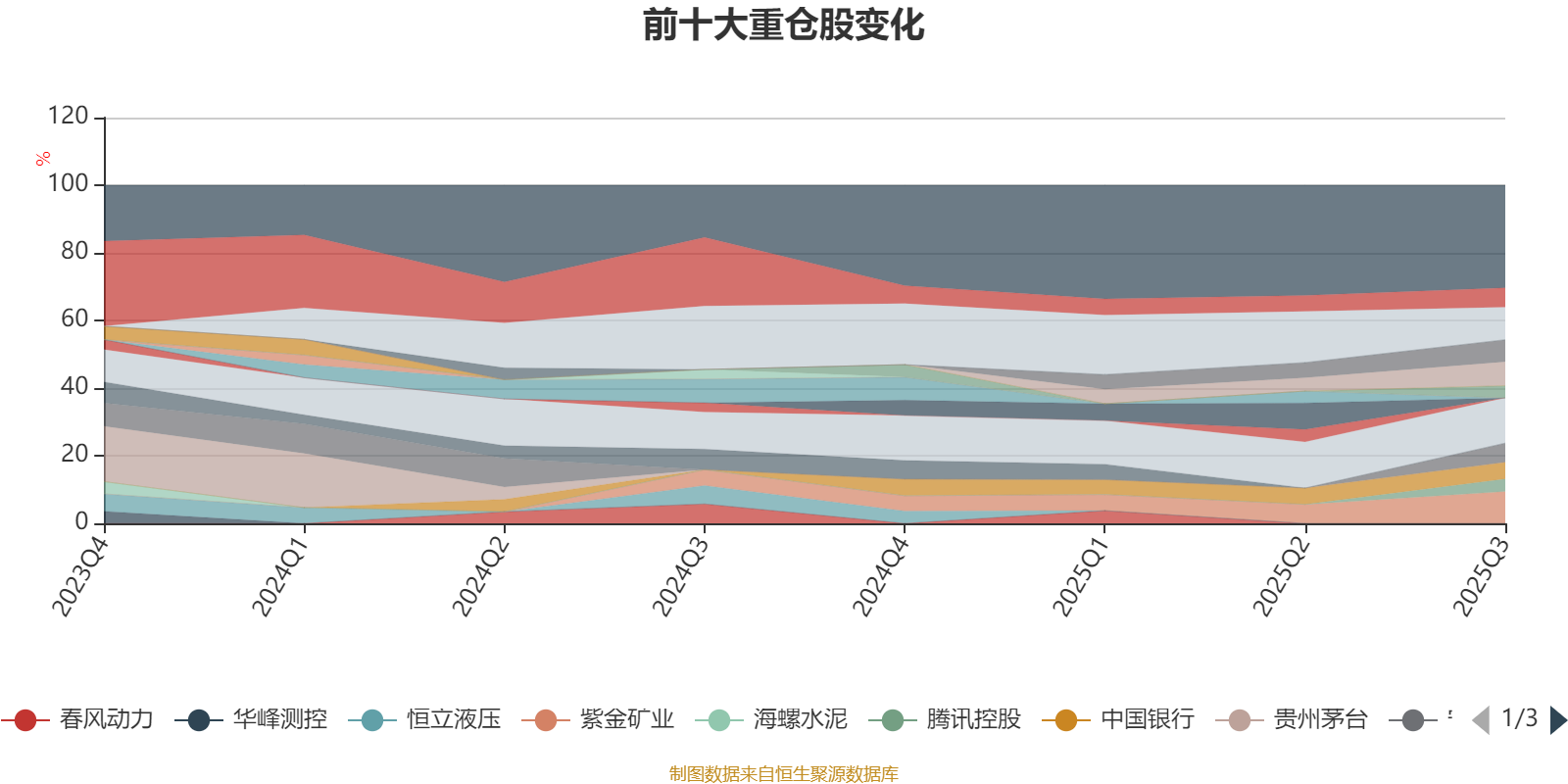 该基金持股集中度较高,近2年前十大重仓股集中度长期超过60%。截至2025年三季度末,基金十大重仓股分别是招商银行、华峰铝业、紫金矿业、阿里巴巴-W、三一重工、星宇股份、宁德时代、中国银行、腾讯控股、伊利股份。