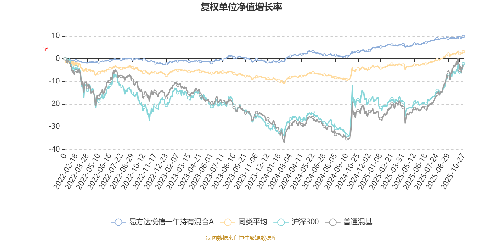截至10月27日,易方达悦信一年持有混合A近三个月复权单位净值增长率为1.06%,位于同类可比基金499/629;近半年复权单位净值增长率为3.97%,位于同类可比基金426/629;近一年复权单位净值增长率为6.50%,位于同类可比基金362/623;近三年复权单位净值增长率为11.12%,位于同类可比基金291/557。