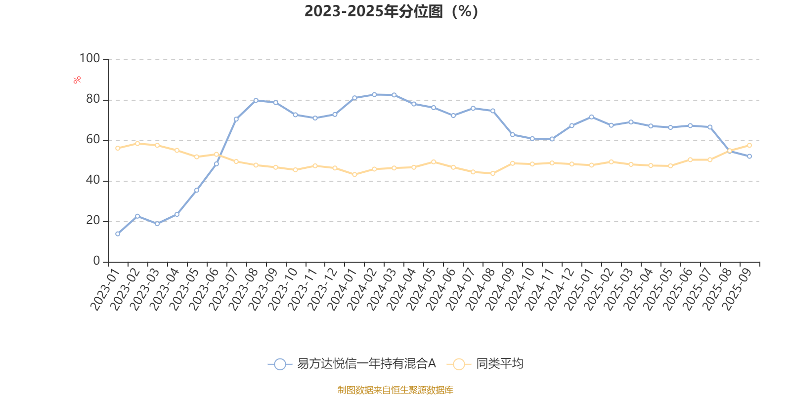 通过所选区间该基金净值增长率分位图,可以观察该基金与同类基金业绩比较情况。图为坐标原点到区间内某时点的净值增长率在同类基金中的分位数。