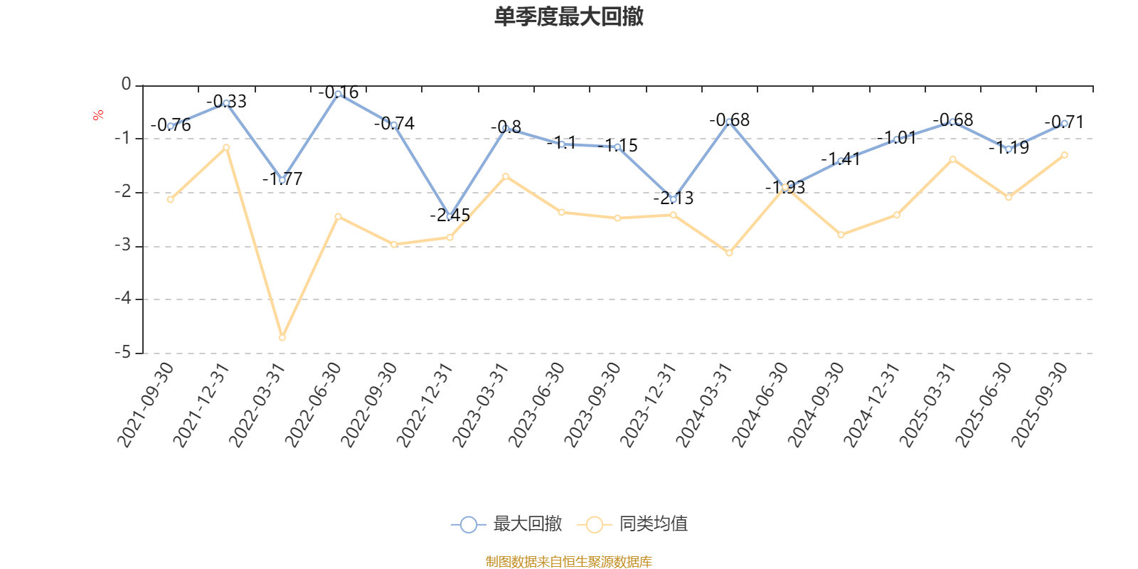 截至10月27日,基金近三年最大回撤为3.05%,同类可比基金排名59/530。单季度最大回撤出现在2022年四季度,为2.45%。
