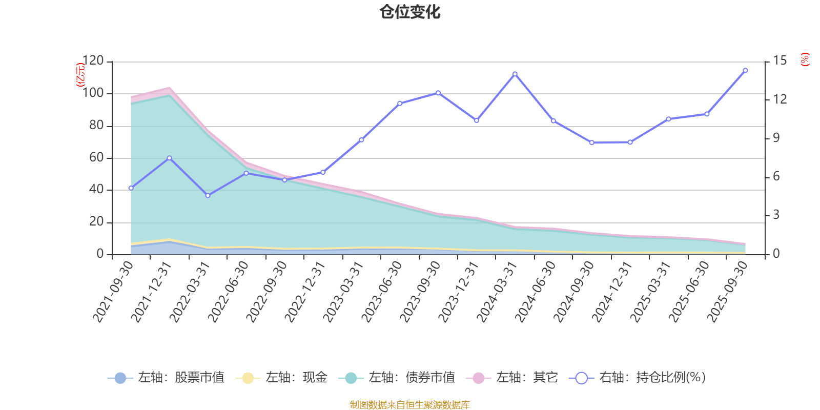 据定期报告数据统计,近三年平均股票仓位为10.64%,同类平均为19.02%。2025年三季度末基金达到14.31%的最高仓位,2022年一季度末最低,为4.58%。