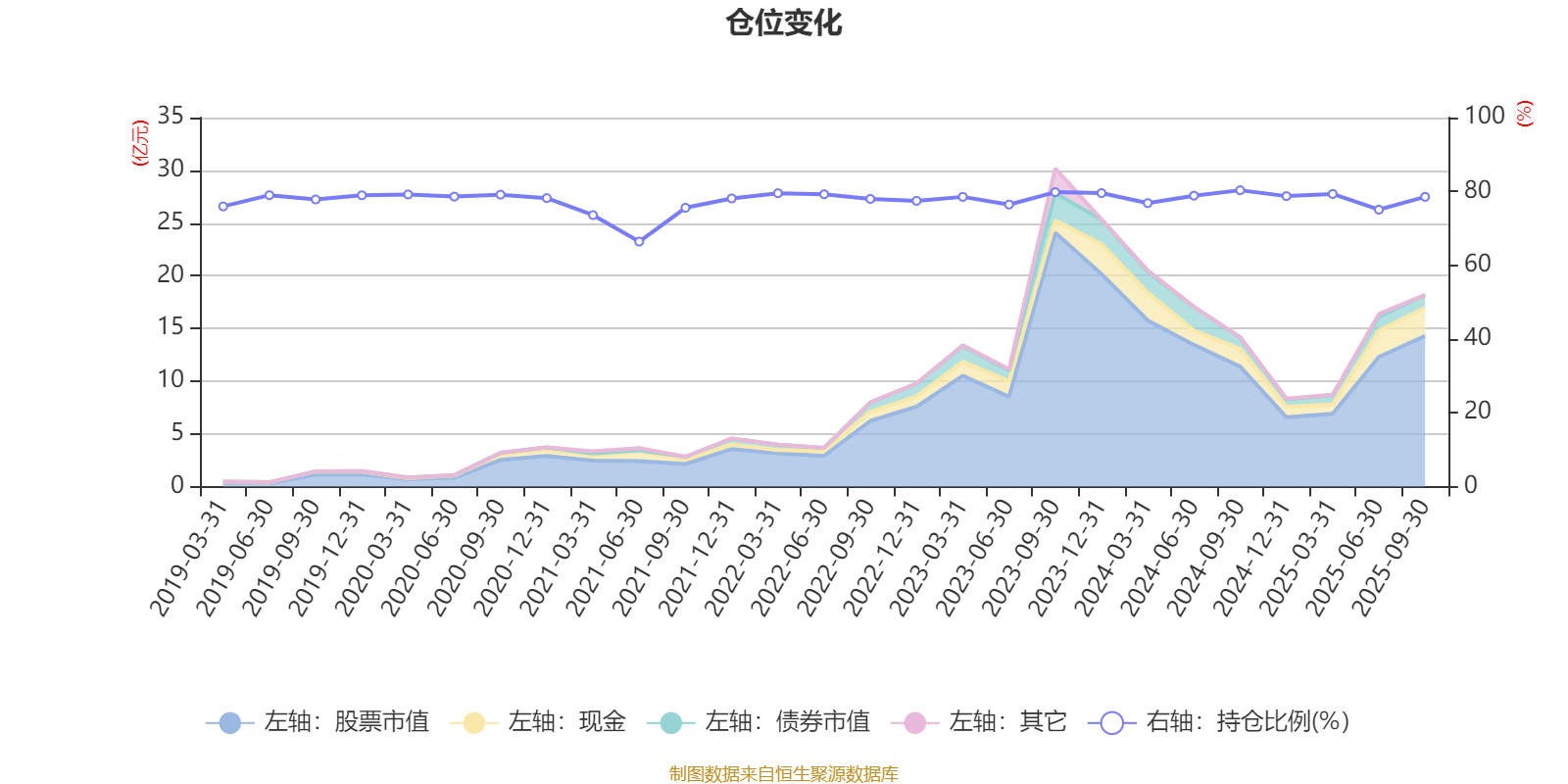 据定期报告数据统计,近三年平均股票仓位为78.28%,同类平均为72.35%。2024年三季度末基金达到80.31%的最高仓位,2021年上半年末最低,为66.39%。