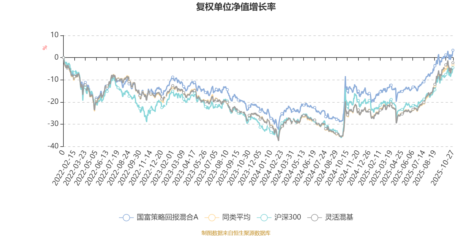 截至10月27日,国富策略回报混合A近三个月复权单位净值增长率为12.77%,位于同类可比基金632/1287;近半年复权单位净值增长率为21.91%,位于同类可比基金710/1287;近一年复权单位净值增长率为19.89%,位于同类可比基金699/1287;近三年复权单位净值增长率为25.63%,位于同类可比基金424/1286。