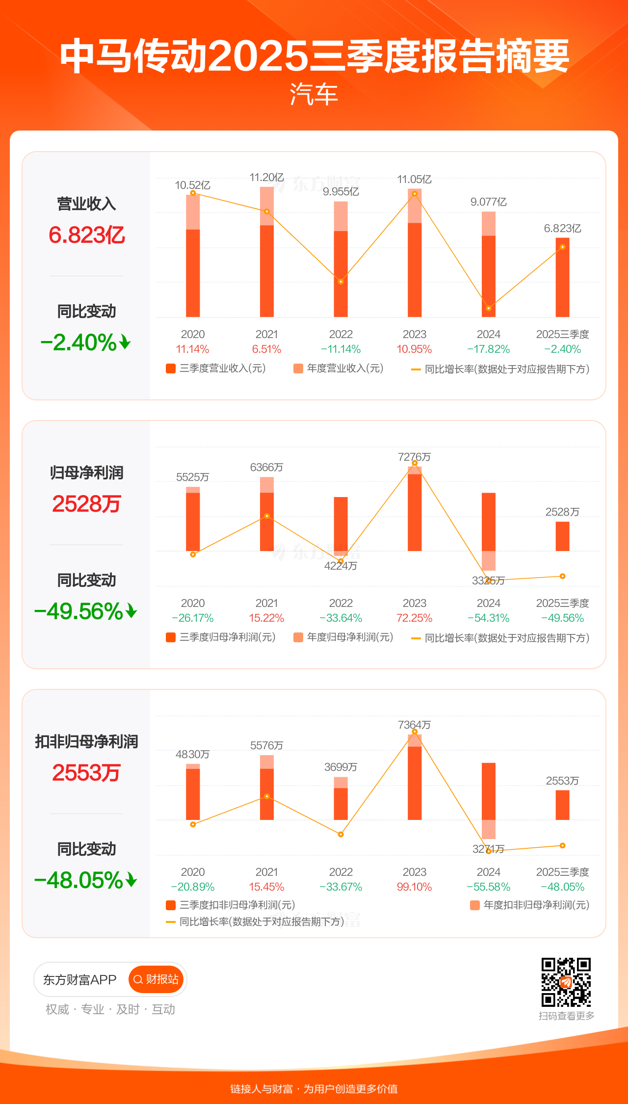 中马传动10月29日发布2025年三季报显示,公司前三季实现营业收入6.82亿元,同比下滑2.40%;归母净利润2528.28万元,同比下滑49.56%;扣非归母净利润2553.24万元,同比下滑48.05%。