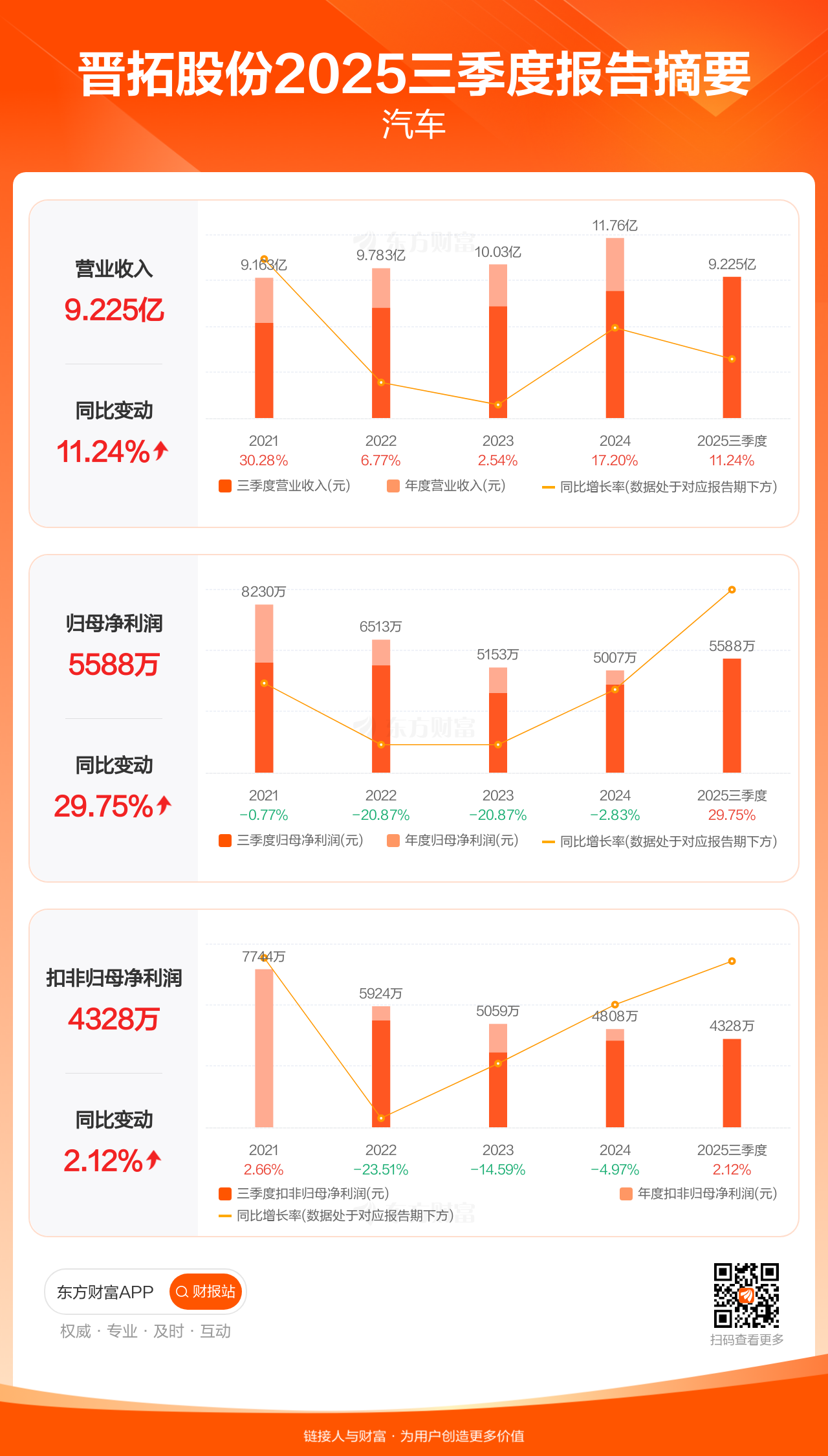 晋拓股份10月29日发布2025年三季报显示,公司前三季实现营业收入9.23亿元,同比增长11.24%;归母净利润5588.24万元,同比增长29.75%;扣非归母净利润4327.71万元,同比增长2.12%。