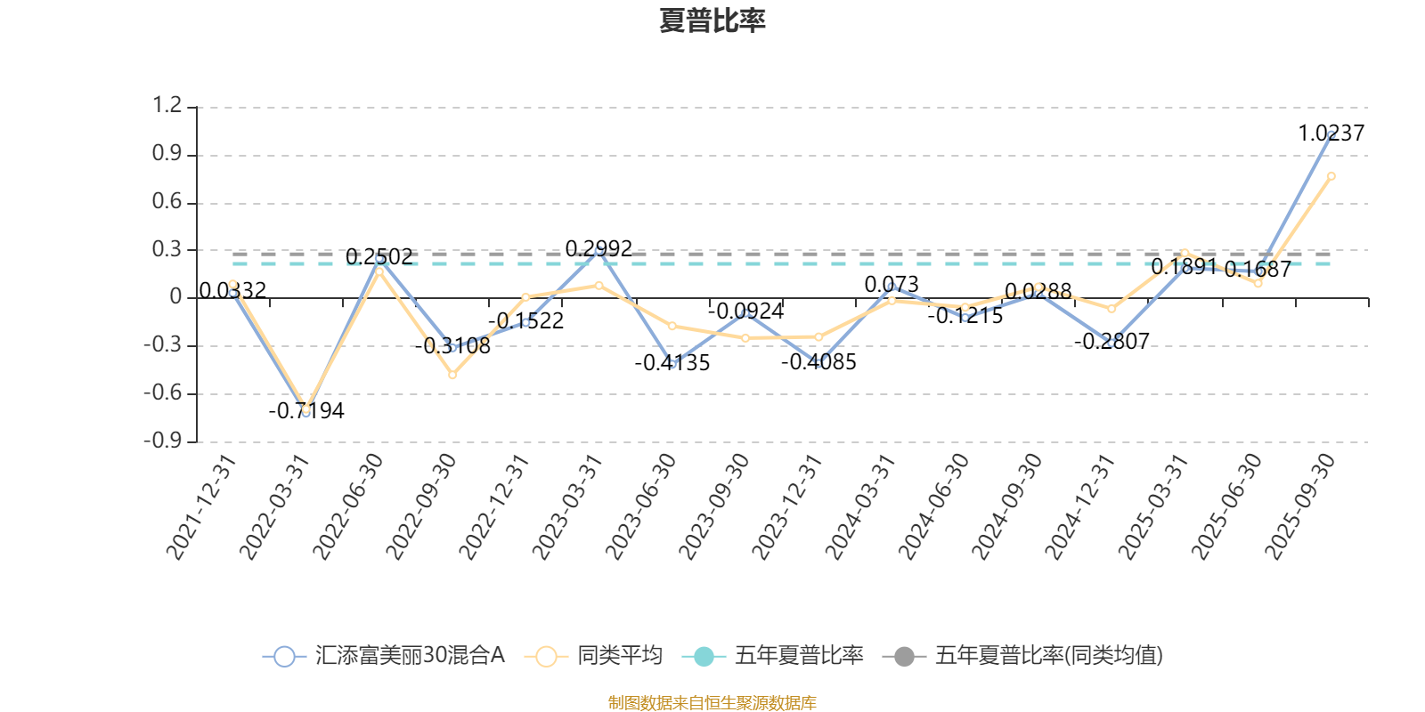 截至9月30日,基金近三年夏普比率为0.5046,位于同类可比基金102/177。