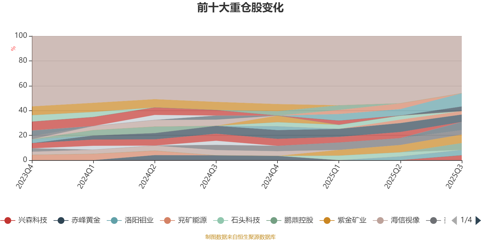 截至2025年三季度末,基金十大重仓股分别是亿纬锂能、紫金矿业、ST华通、宁德时代、鹏鼎控股、洛阳钼业、兴森科技、大智慧、美的集团、深南电路。