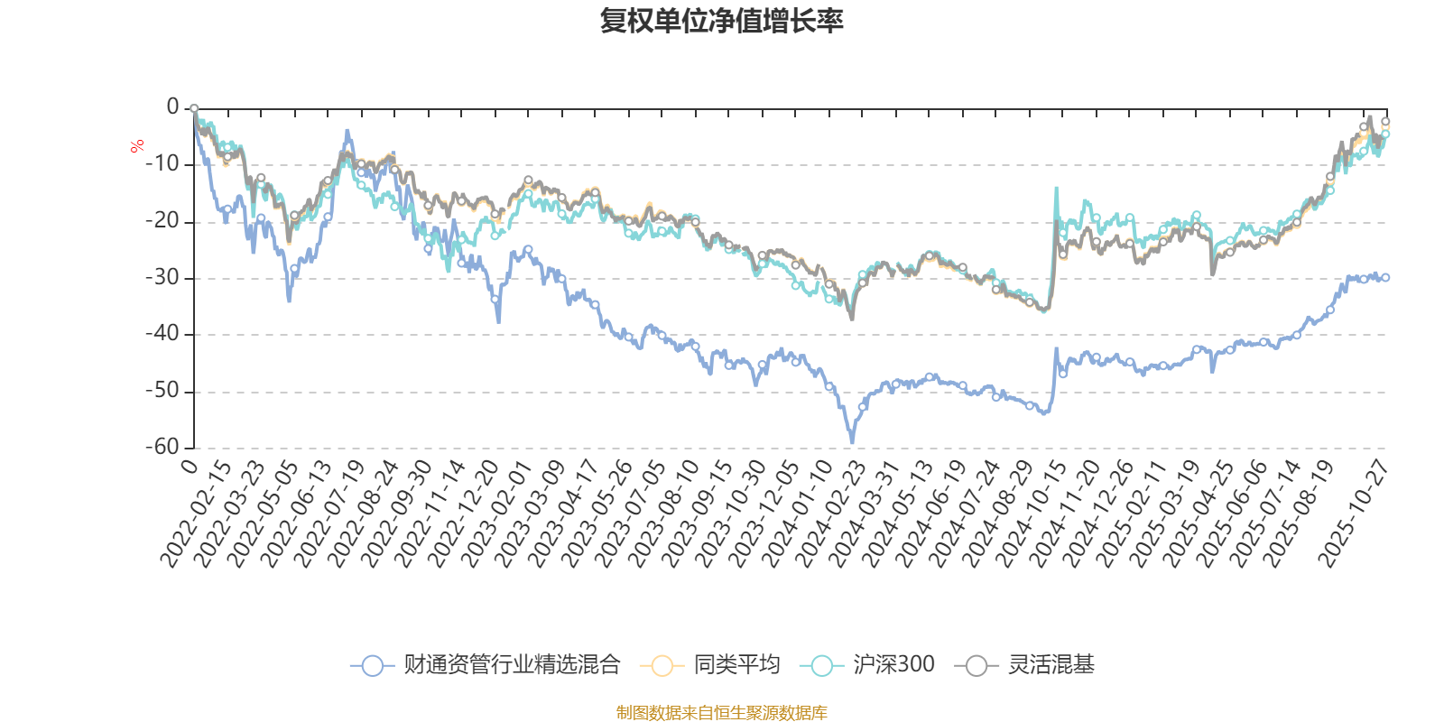 截至10月27日,财通资管行业精选混合近三个月复权单位净值增长率为10.87%,位于同类可比基金709/1287;近半年复权单位净值增长率为22.33%,位于同类可比基金691/1287;近一年复权单位净值增长率为26.09%,位于同类可比基金540/1287;近三年复权单位净值增长率为-8.94%,位于同类可比基金1127/1286。