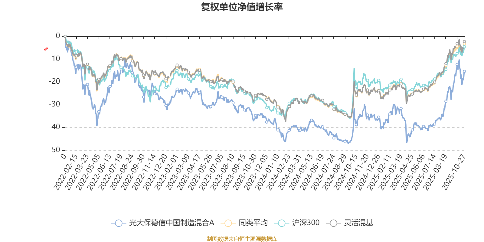 截至10月27日,光大保德信中国制造混合A近三个月复权单位净值增长率为32.18%,位于同类可比基金164/1287;近半年复权单位净值增长率为43.60%,位于同类可比基金217/1287;近一年复权单位净值增长率为29.08%,位于同类可比基金471/1287;近三年复权单位净值增长率为12.34%,位于同类可比基金713/1286。