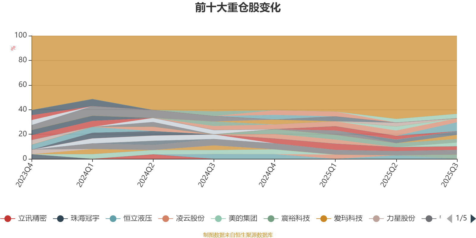 截至2025年三季度末,基金十大重仓股分别是浙江荣泰、宁德时代、兆易创新、震裕科技、长川科技、宗申动力、厦钨新能、汇川技术、豪威集团、东睦股份。